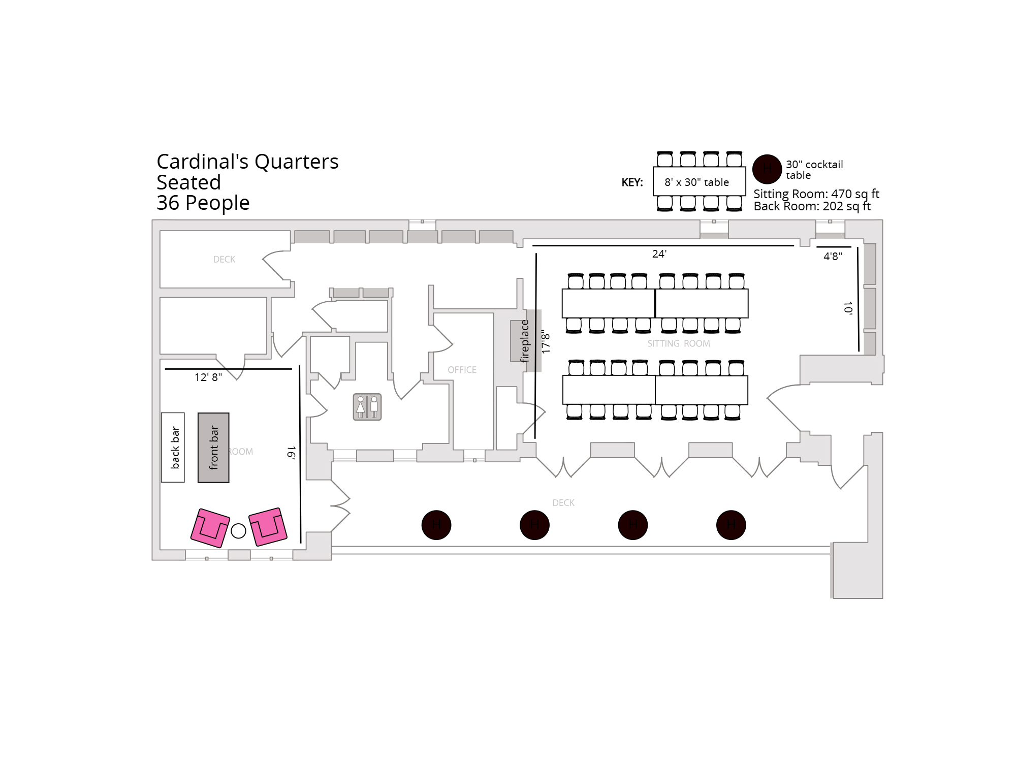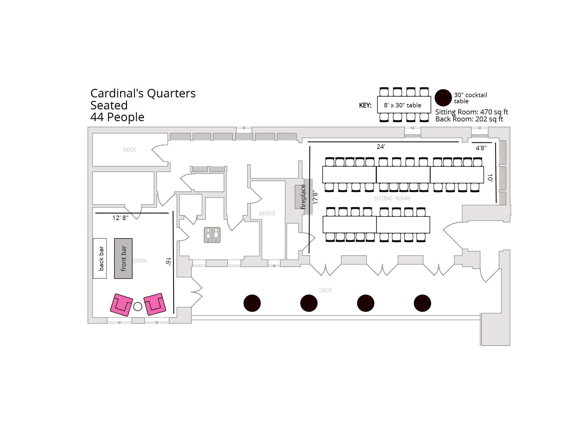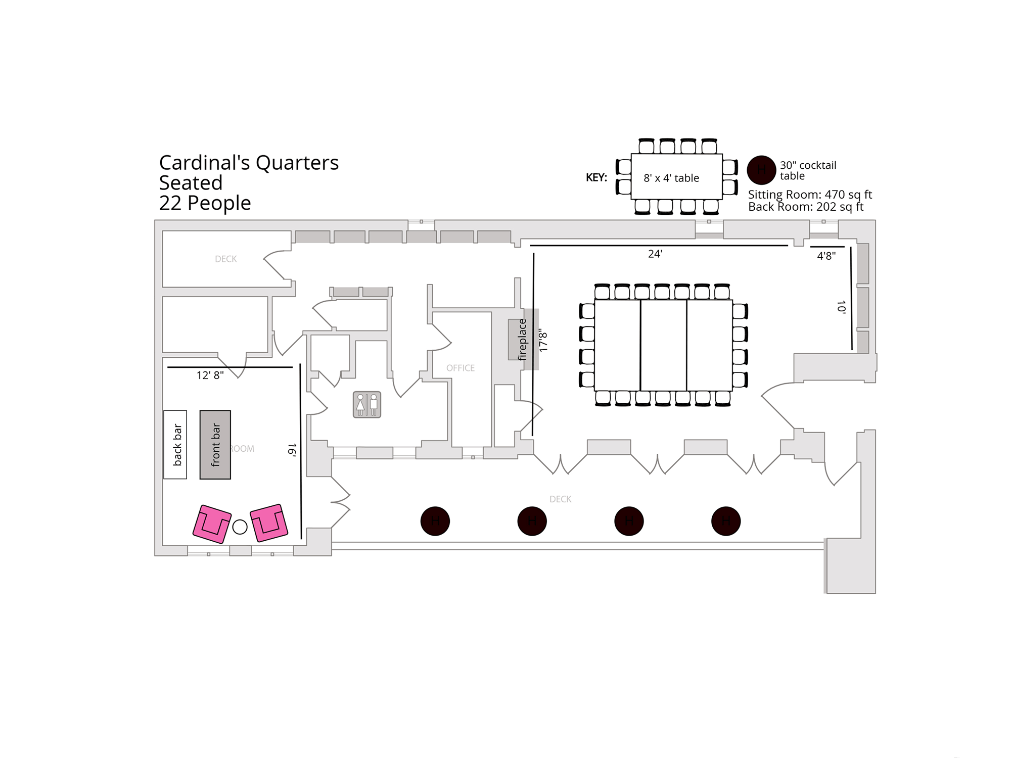 Ideal for intimate weddings, cocktail parties, bridal showers, birthday celebrations, receptions, photoshoots, and filming, the Cardinal’s Quarters offers privacy without sacrificing energy. With its private en suite restroom and a layout designed for natural flow, it’s a space that feels exclusive, comfortable, and distinctly Los Angeles. A room where your event feels elevated from the very first toast.