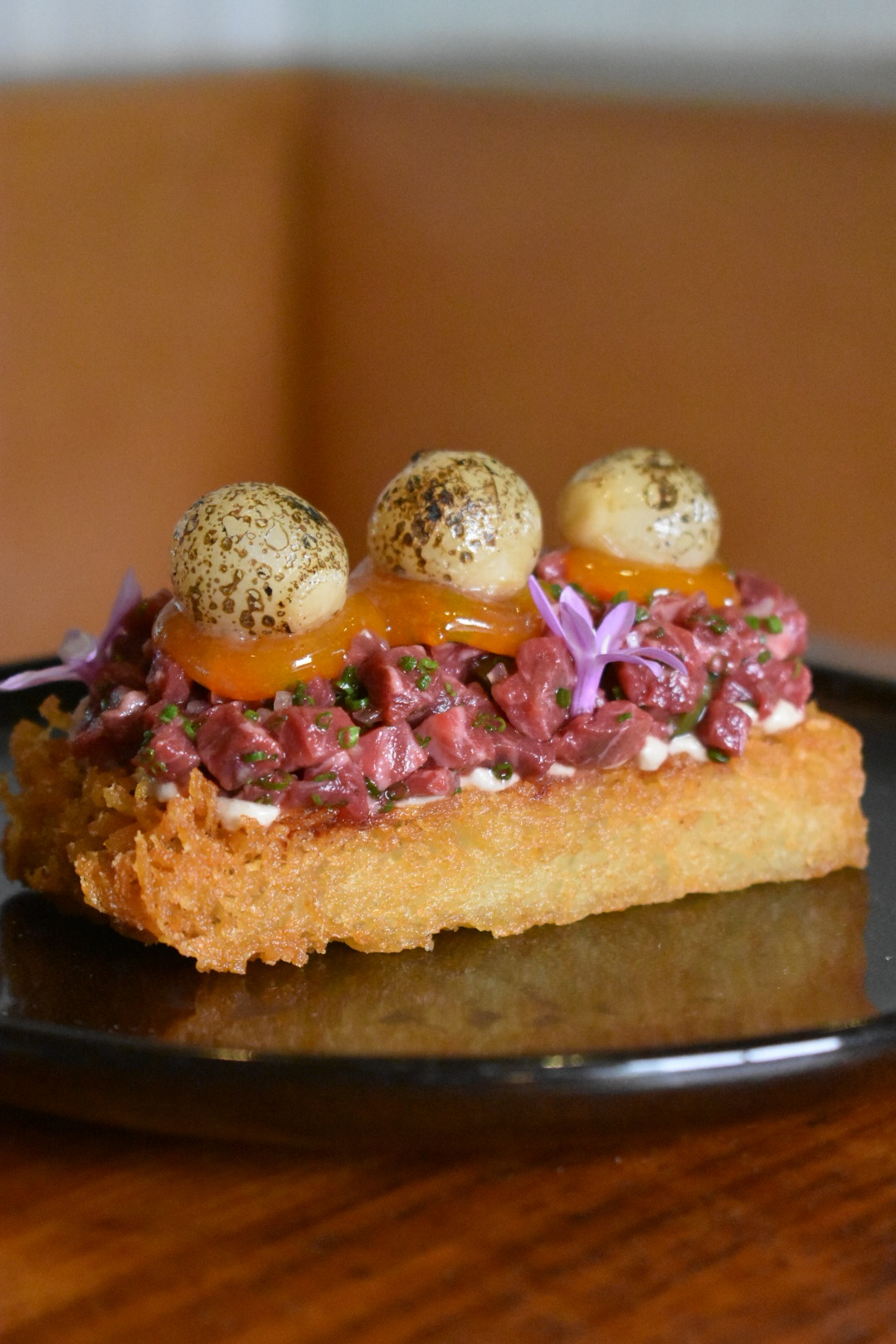VENISON TARTARE caramelized onion crema, egg jam, pickled pearl onion, shaved marrow, potato rosti