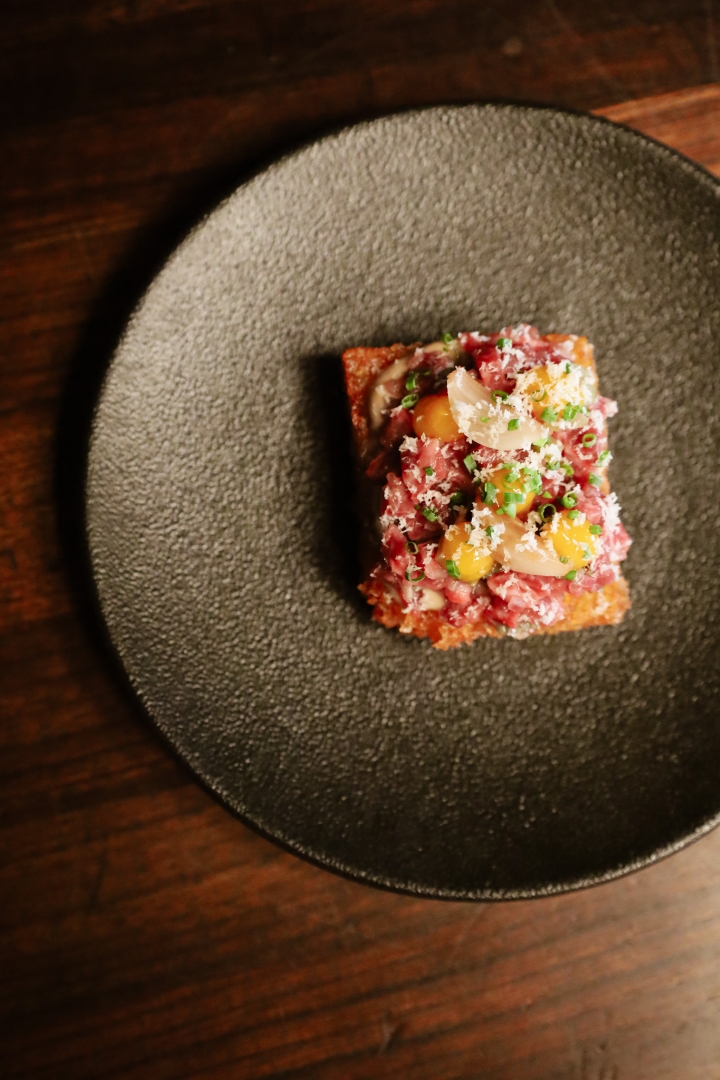 BEEF TARTARE caramelized onion, potato rosti, egg jam, pickled onion, marrow 20